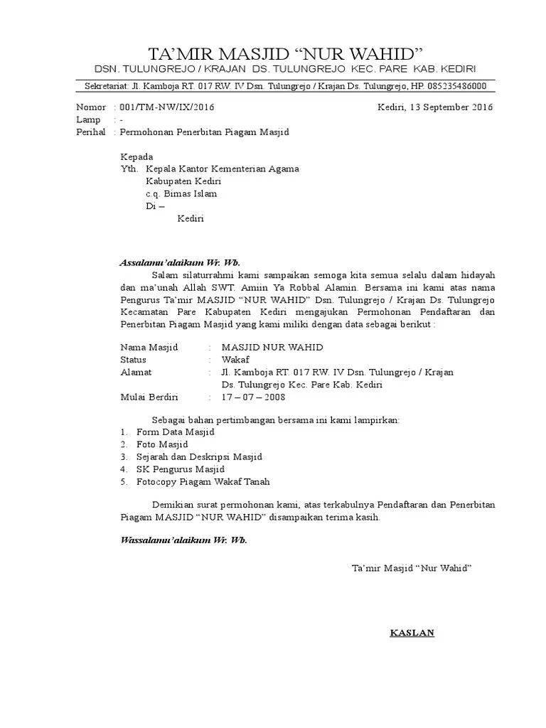 Ada kalanya ketika kita sekolah, kuliah, bekerja atau lainnya dalam lingkungan sosial bermasyarakat baik itu di sekolah, kampus, kantor atau lingkungan kedaerahan, kita akan dihadapkan dalam situasi tidak dapat mengerjakan sendiri dan memerlukan bantuan, pertolongan, izin. Ikatan remaja masjid nurul yaqien tassilli. Santri siap guna daarut tauhiid bandung gegerkalong girang no. Surat permohonan sendiri dapat bersifat resmi atau pun tidak resmi. Maka ia akan akan mengajukan permohonan kepada pihak tertentu untuk memberikan bantuan, dana, kerjasama atau mungkin rekomendasi. Cara pinjam uang di koperasi ternyata mudah dan cepat. Santri siap guna daarut tauhiid bandung gegerkalong girang no. Sk pengurus masjid adalah salah satu sk yang dikeluarkan/ditetapkan oleh kepala desa untuk menetapkan mengangkat susunan pengurus masjid di desa. Penjelasan lengkap seputar contoh surat permohonan. Jangan lupa shere dan like artikel ini. Pada umumnya, kita bisa mendapatkan surat rekomendasi dari pihak lain ataupun dari pejabat yang berwenang di. Contoh surat permohonan pindah tugas.
