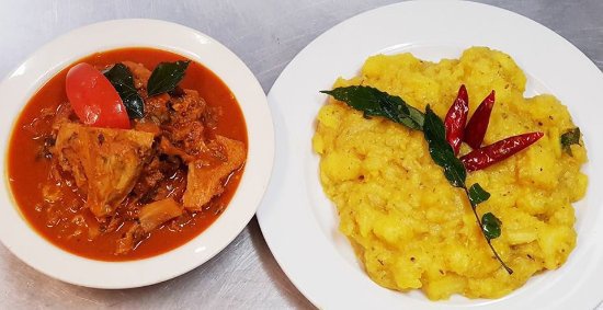 fish curry, ½ cup rice, ½ cup vegetable curry, and cucumber and tomato salad.