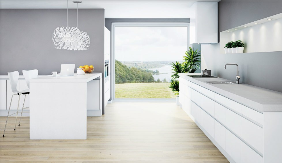 These kitchens generally have an all white theme with a design that allows a lot of natural light and space inside.